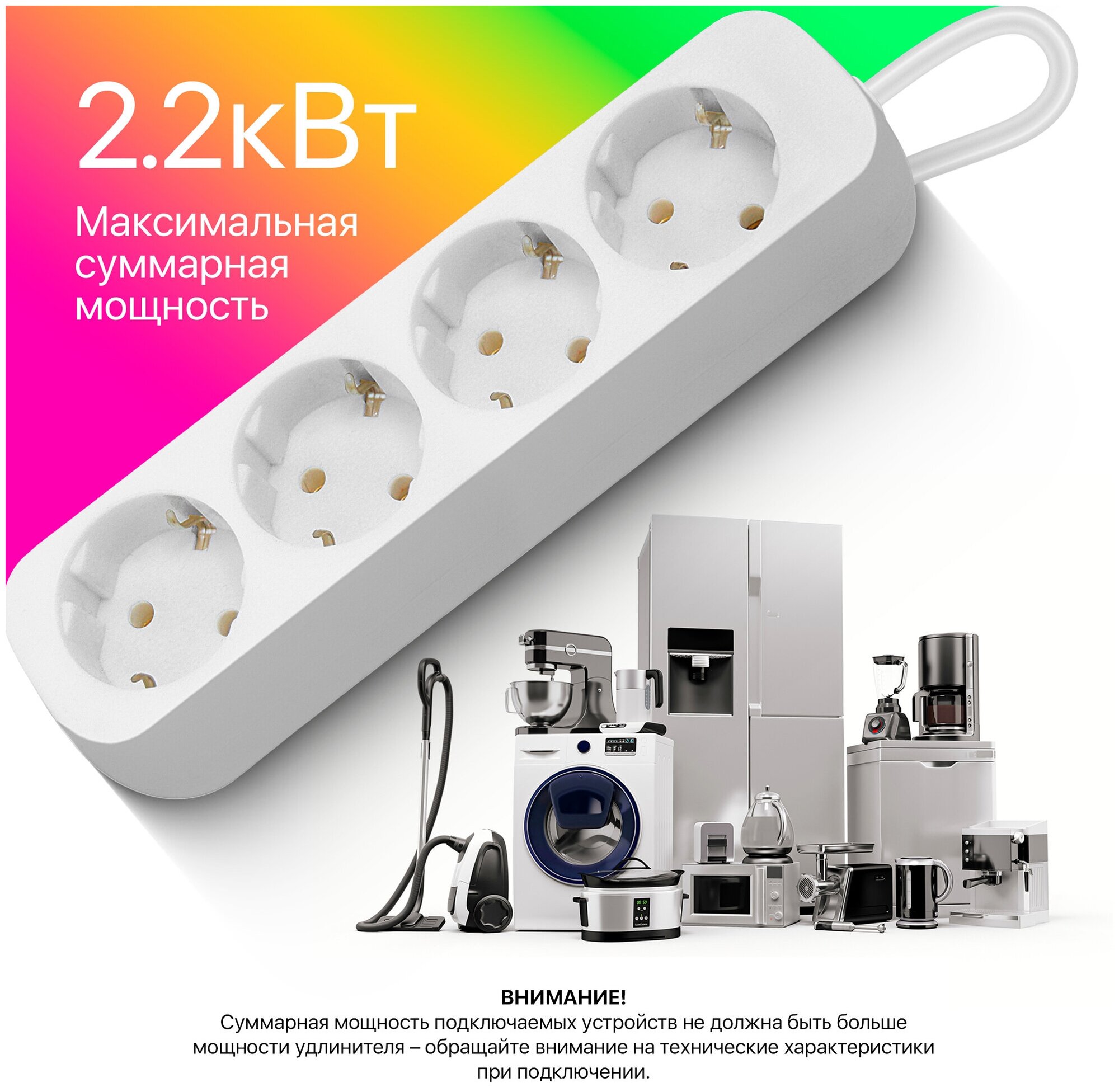 Удлинитель DEFENDER E430, 4 розетки, ПВС 3*1,0 мм2, мощность 2200 Вт, ток 10А, с/з, белый, 3,0 м