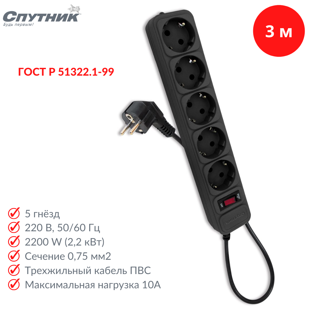 Сетевой фильтр-удлинитель SP-530 3м, Спутник, чёрный
