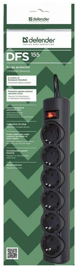 Defender Фильтр DFS 155 5.0 m, 6 розеток, черный 99496 информация: