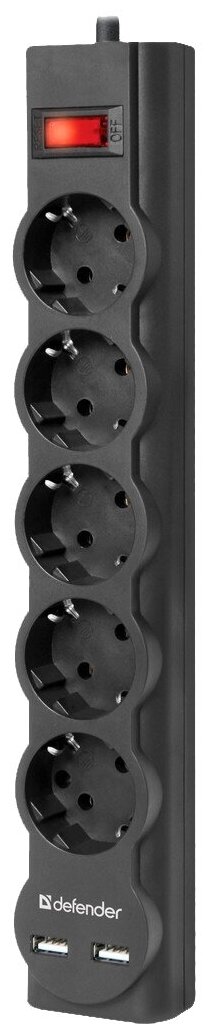 Сетевой фильтр Defender ES 5,0 м, черный, 5 розеток, 2xUSB, 2.1A