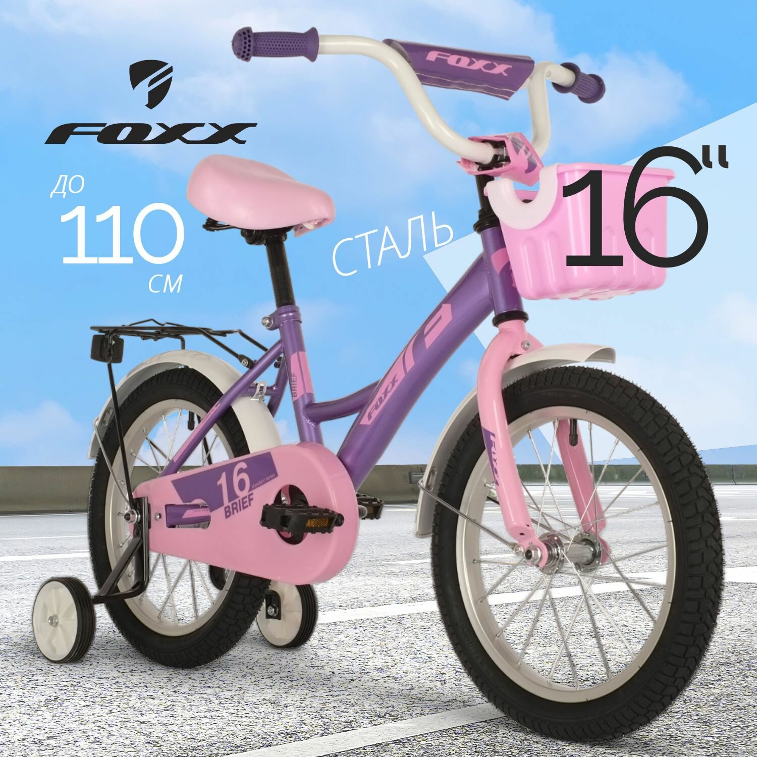 Отзывы на Велосипед детский для девочки 16" FOXX BRIEF двухколесный фиолетовый, стальная рама на рост 100-125 см со съемными дополнительными колесами и корзиной