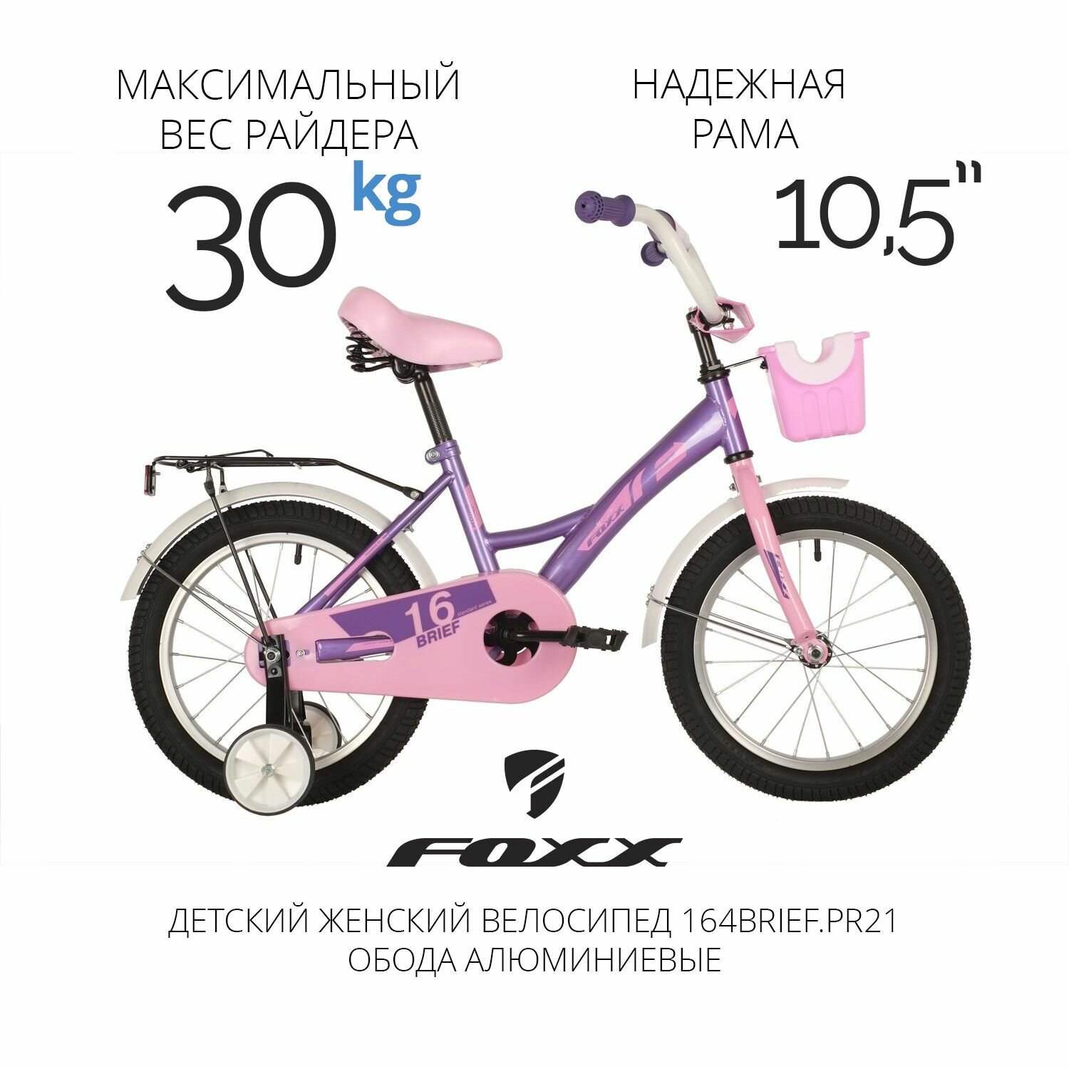 Велосипед детский для девочки 16" FOXX BRIEF двухколесный фиолетовый, стальная рама на рост 100-125 см со съемными дополнительными колесами и корзиной информация: