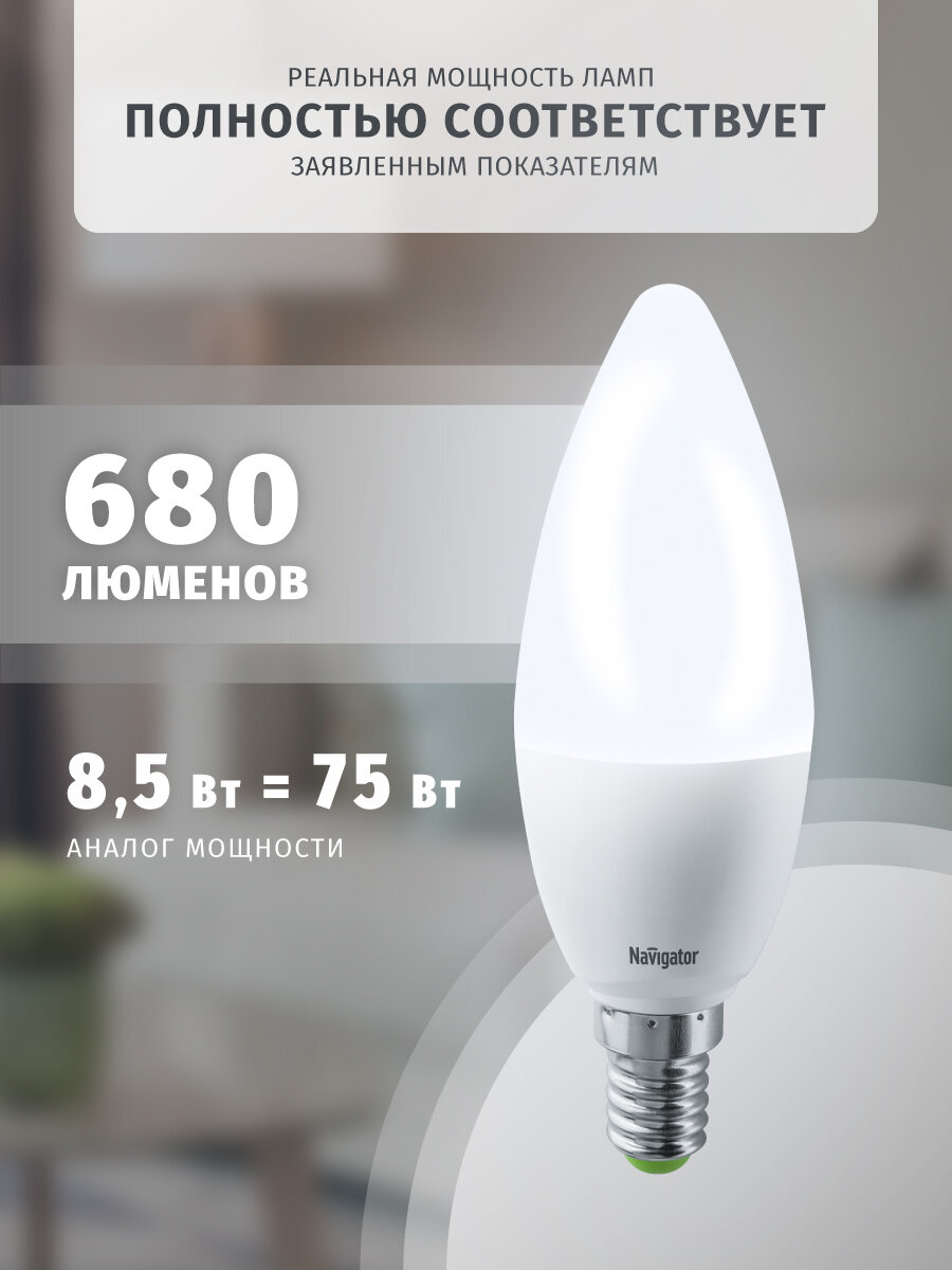 Отзывы на Лампа светодиодная Navigator 61 325, 8.5 Вт, свеча Е14, дневной свет 4000К, упаковка 10 шт.
