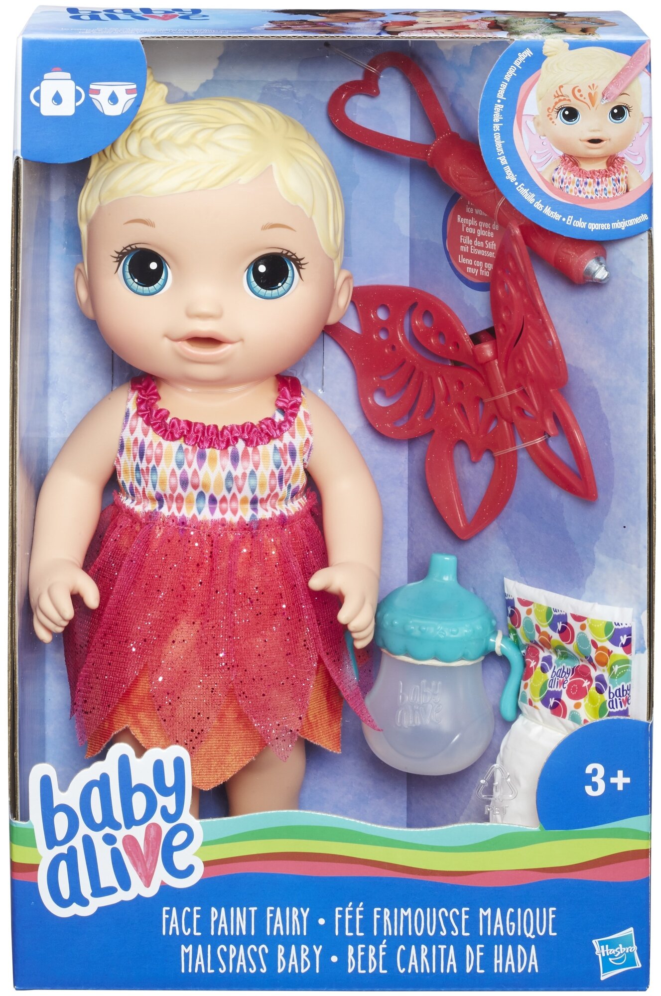 | Дополнительная информация | аквагрим смывается теплой водой; кукла умеет пить из бутылочки; кукла умеет писать; съемный подгузник; съёмные крылья и платье; |