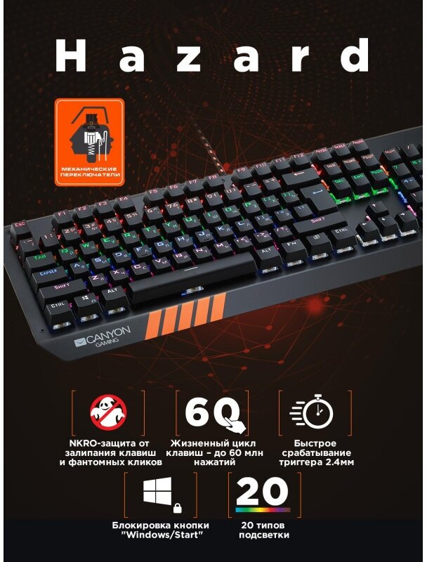 Клавиатура игровая механическая Hazard CANYON : 104 клавиш, 17 "горячих" клавиш, 20 видов подсветки, черная
