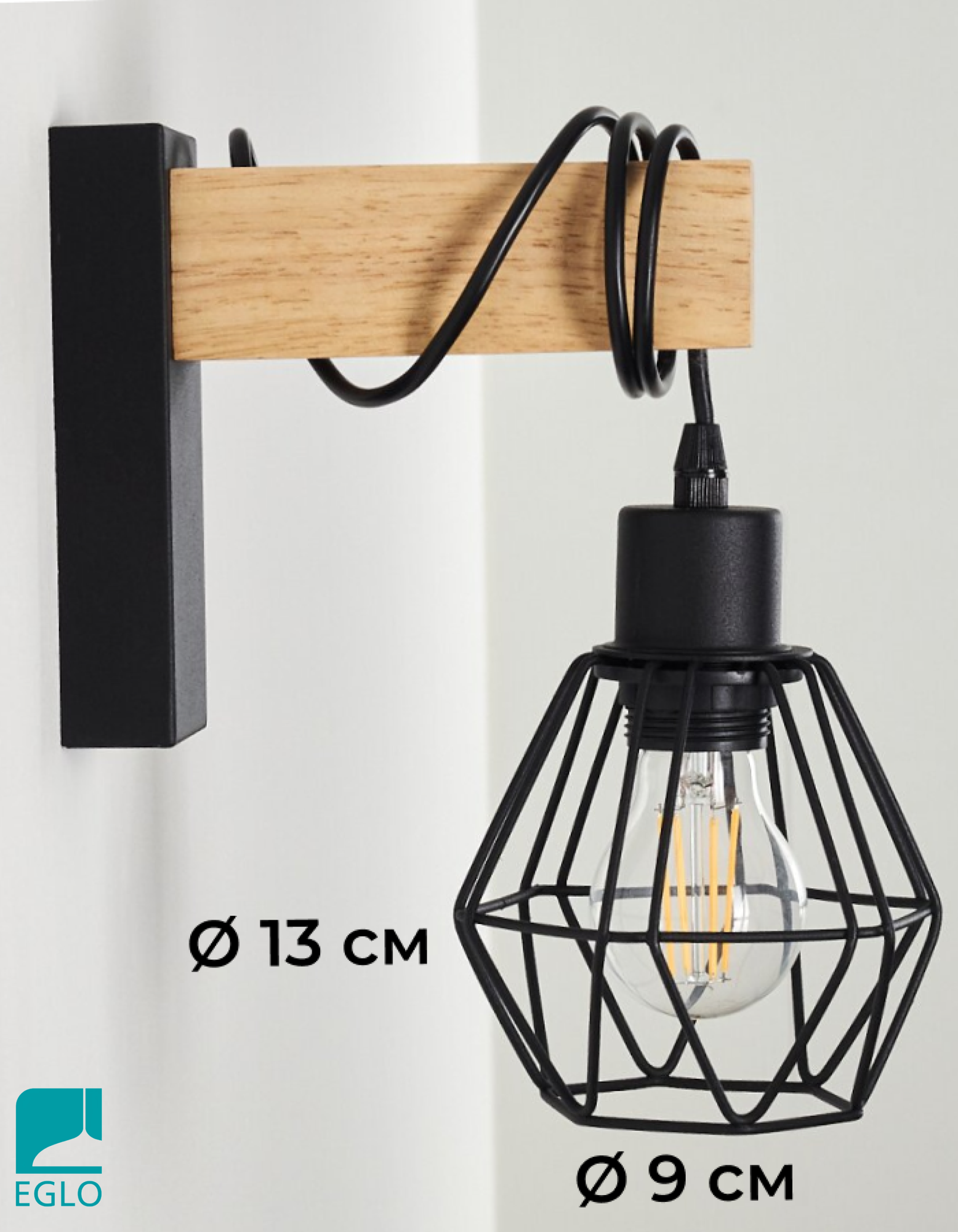 Бра настенный из натурального дерева EGLO Townshend 20, дизайнерский светильник для гостиной, ретро лампа для освещения спальни, прихожей, с черным плафоном и проводом, натуральное дерево, E27, 60 Вт 3 306 ₽