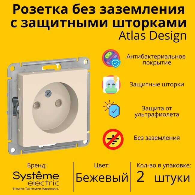 Розетка электрическая Schneider Electric (Systeme Electric) Atlas Design без заземления с защитными шторками, 16А Бежевый ATN000249 - 2 шт. информация: