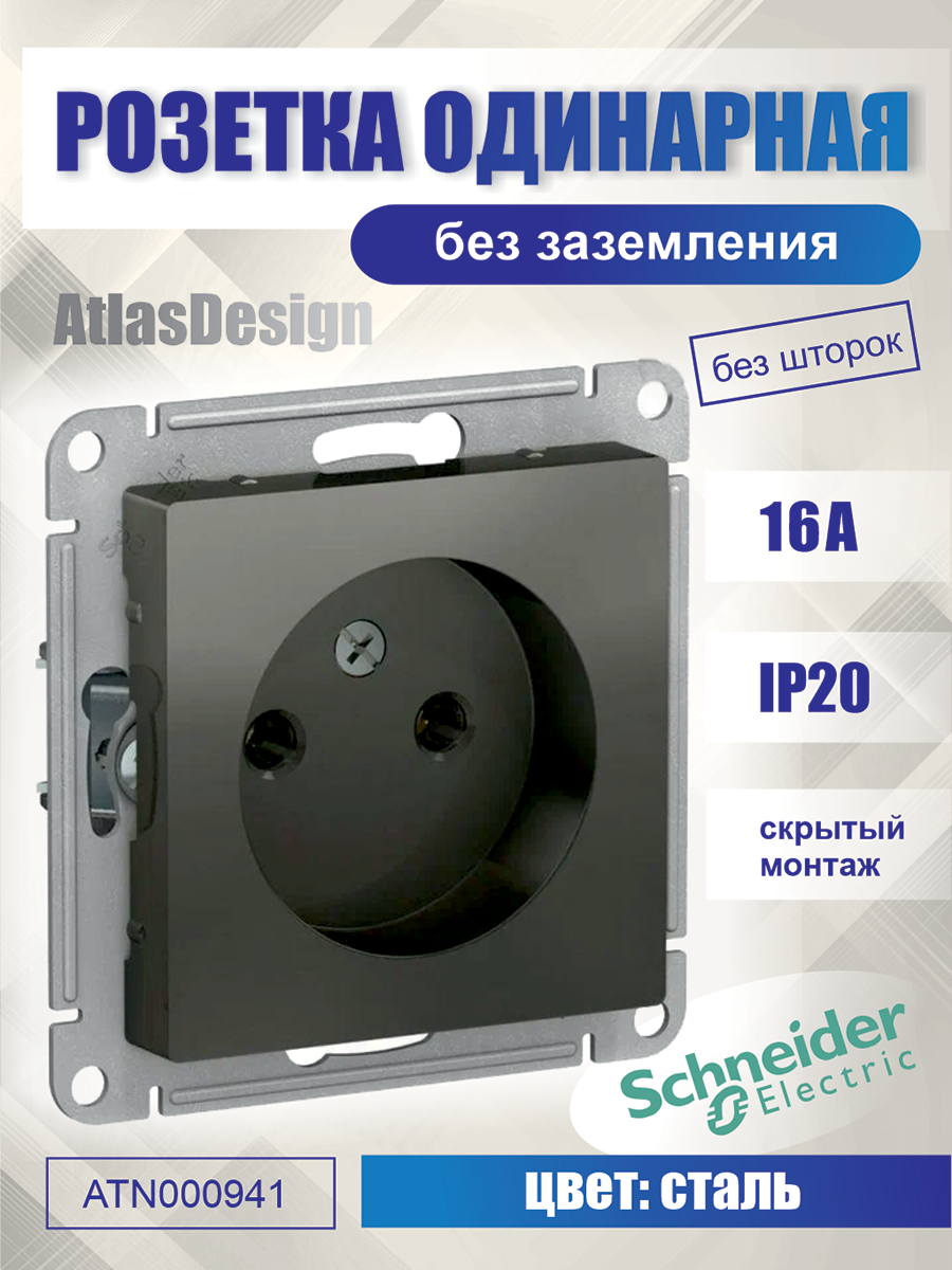 Розетка электрическая Schneider Electric (Systeme Electric) Atlas Design без заземления, 16А Сталь ATN000941 - 1 шт. информация: