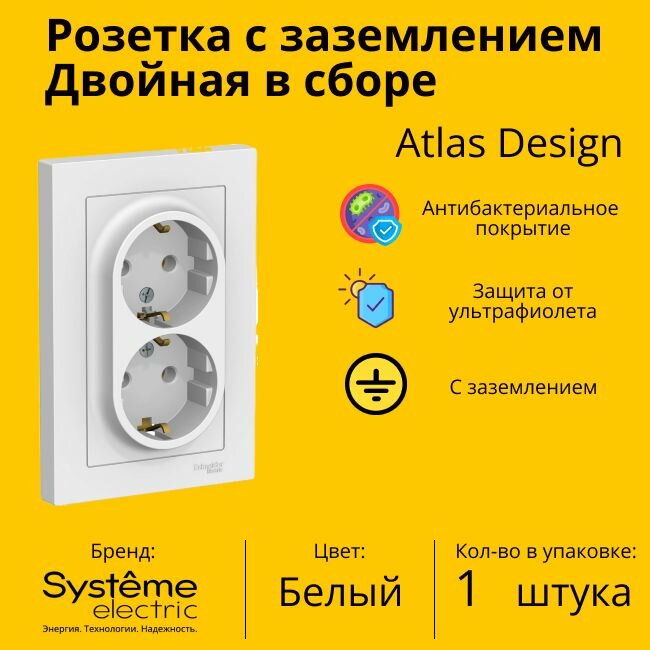 Розетка электрическая двухместная Schneider Electric (Systeme Electric) Atlas Design с заземлением, в сборе 16А, Белый ATN000124 - 1 шт. информация: