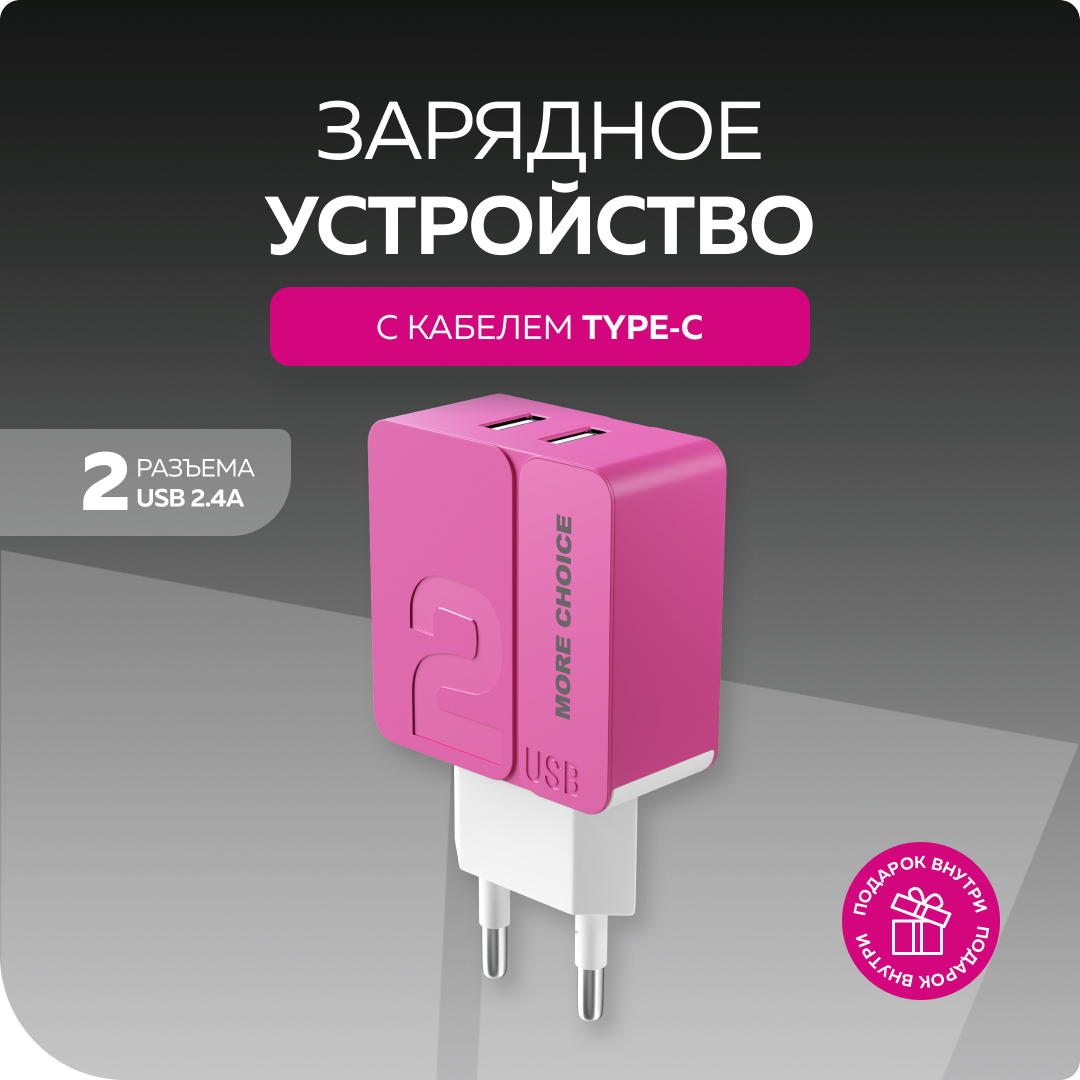 Сетевое зарядное устройство 2USB 2.4A в комплекте с дата-кабелем Type-C More choice NC46a 1м Pink 582 ₽