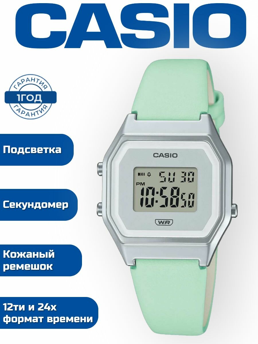 LA680WEL-3D Casio наручные часы кварцевые WR30 (3 атм) женские серебряный, зеленый секундомер будильник отображение дня недели, отображение числа подсветка дисплея акриловое стекло 6 658 ₽