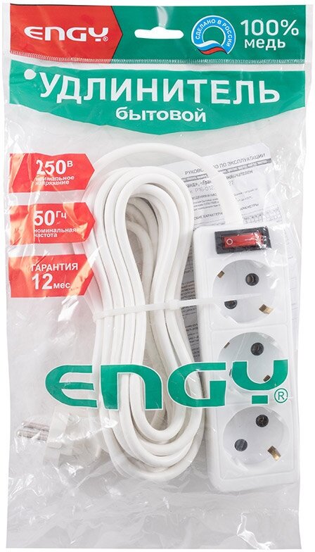 Удлинитель электрический с выключателем Engy "Гранд", 5 метров, 3 розетки 835 ₽