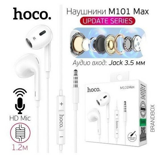 Проводные наушники HOCO M101 Max Crystal, Jack 3.5mm, 1.2 м, белый информация: