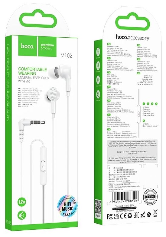 Наушники проводные с микрофоном Hoco M102 Ingenious, MiniJack 3.5мм, 1.2 метра, белые информация: