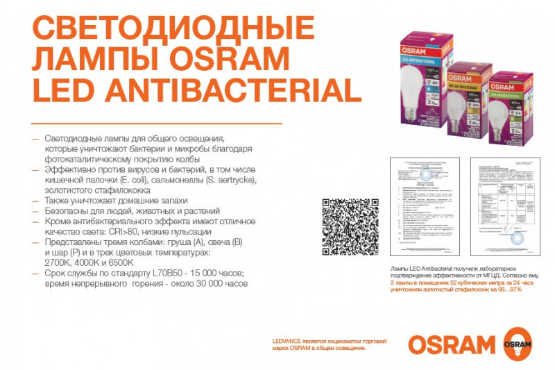 Светодиодная антибактериальная лампа Ledvance-osram OSRAM LCCLA 60 8,5W/865 230VFR E27 806lm