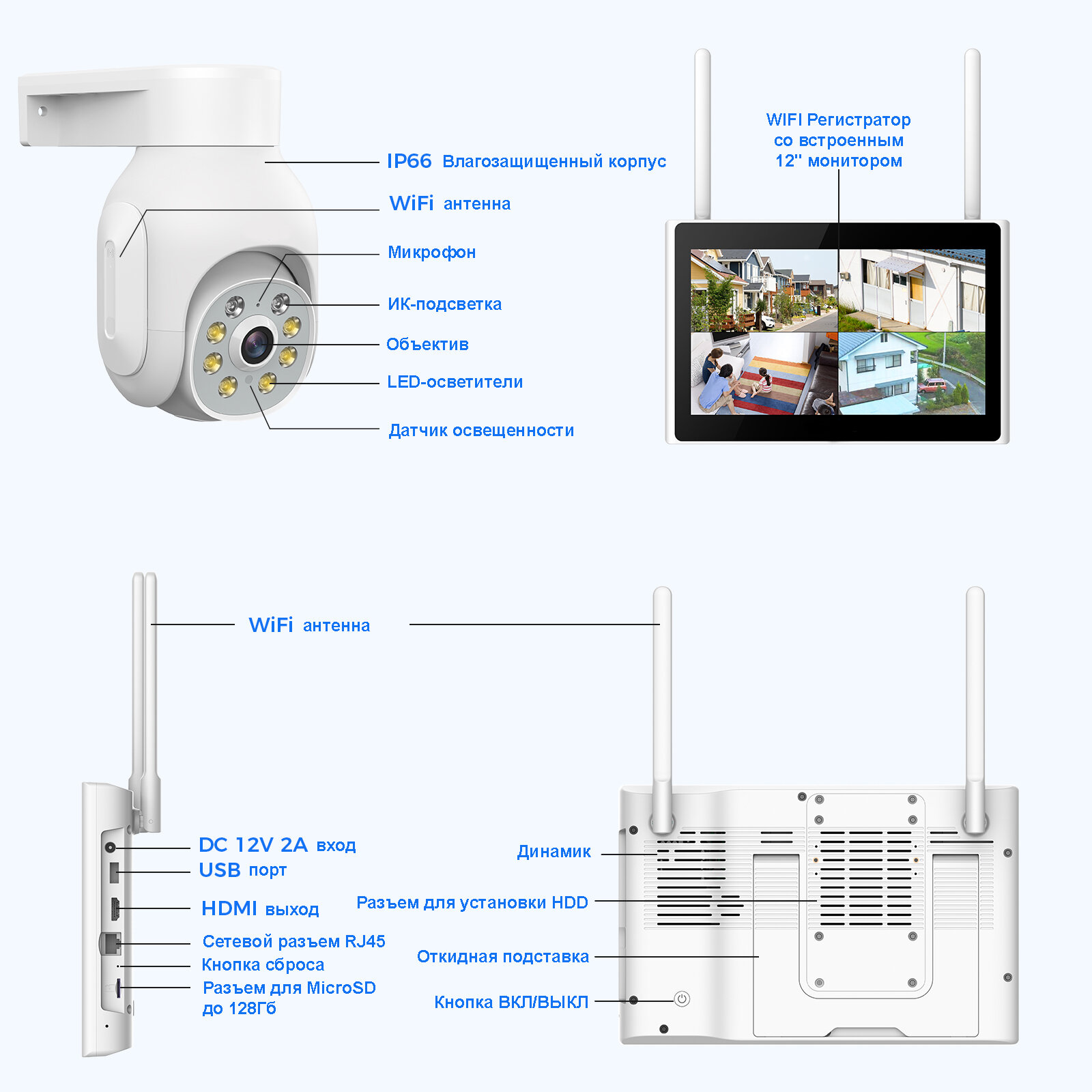 Отзывы на Готовый комплект видеонаблюдения на 4 IP WIFI PTZ камеры 3Mp , система видеонаблюдения с 12'' монитором MiCam 3048 LCD