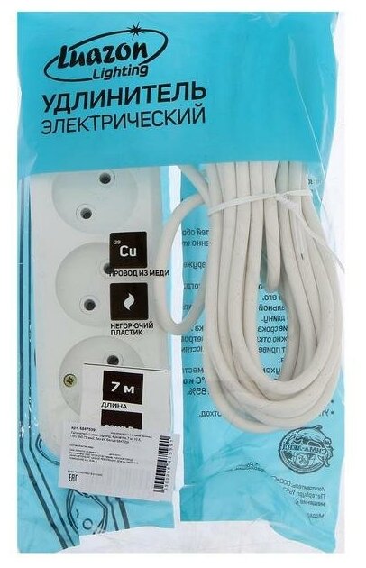 Отзывы на Luazon Lighting Удлинитель 4 розетки, 7 м, 10 А, 2200 Вт, ПВС 2х0.75 мм2, без з/к, белый