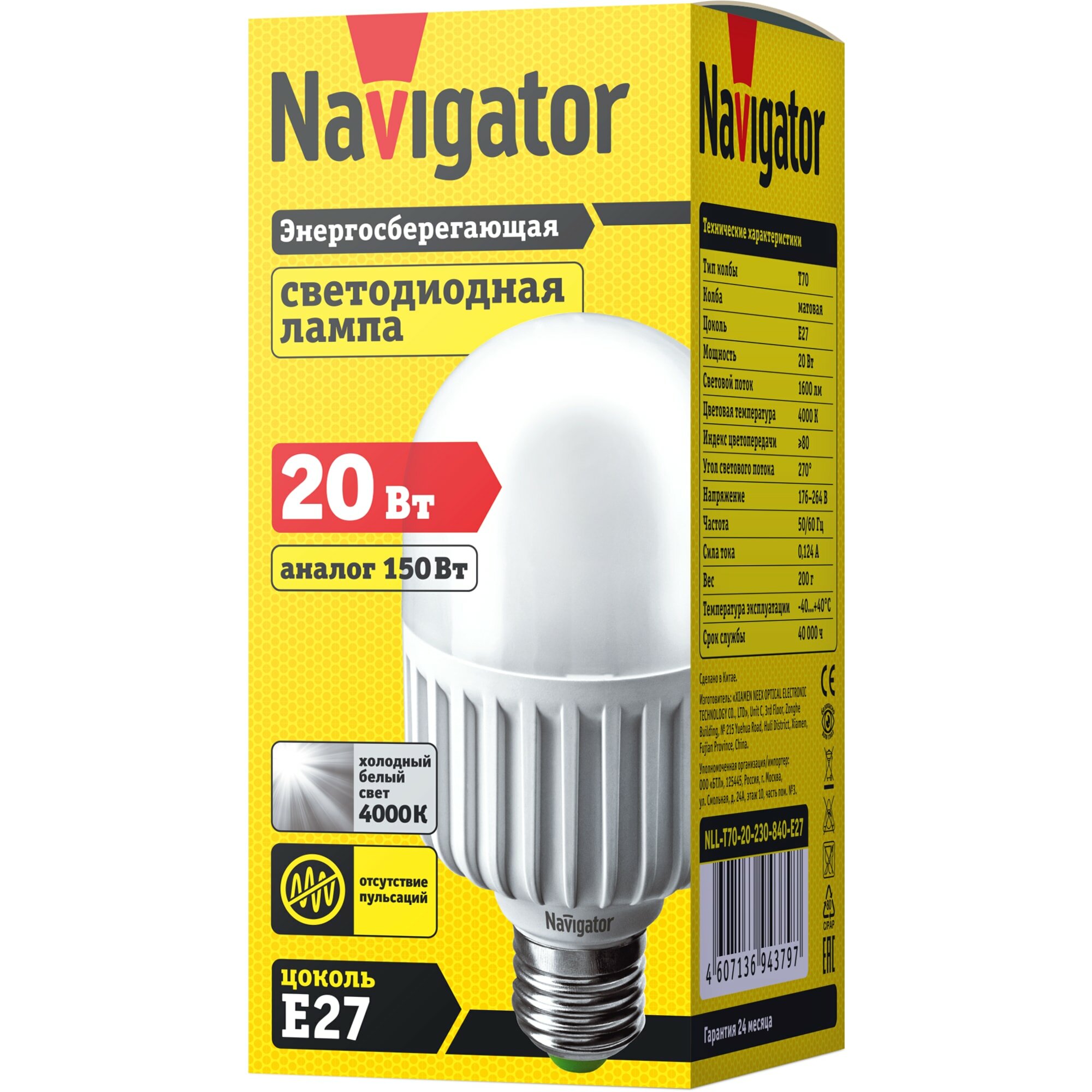 Светодиодная лампа высокой мощности Navigator 94 379, 20 Вт, Е27, дневной свет 4000К, 1 шт.