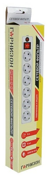 Сетевой фильтр "Гарнизон", 6 розеток, 5 м, 10 А, 2200 Вт, с з/к, белый информация: