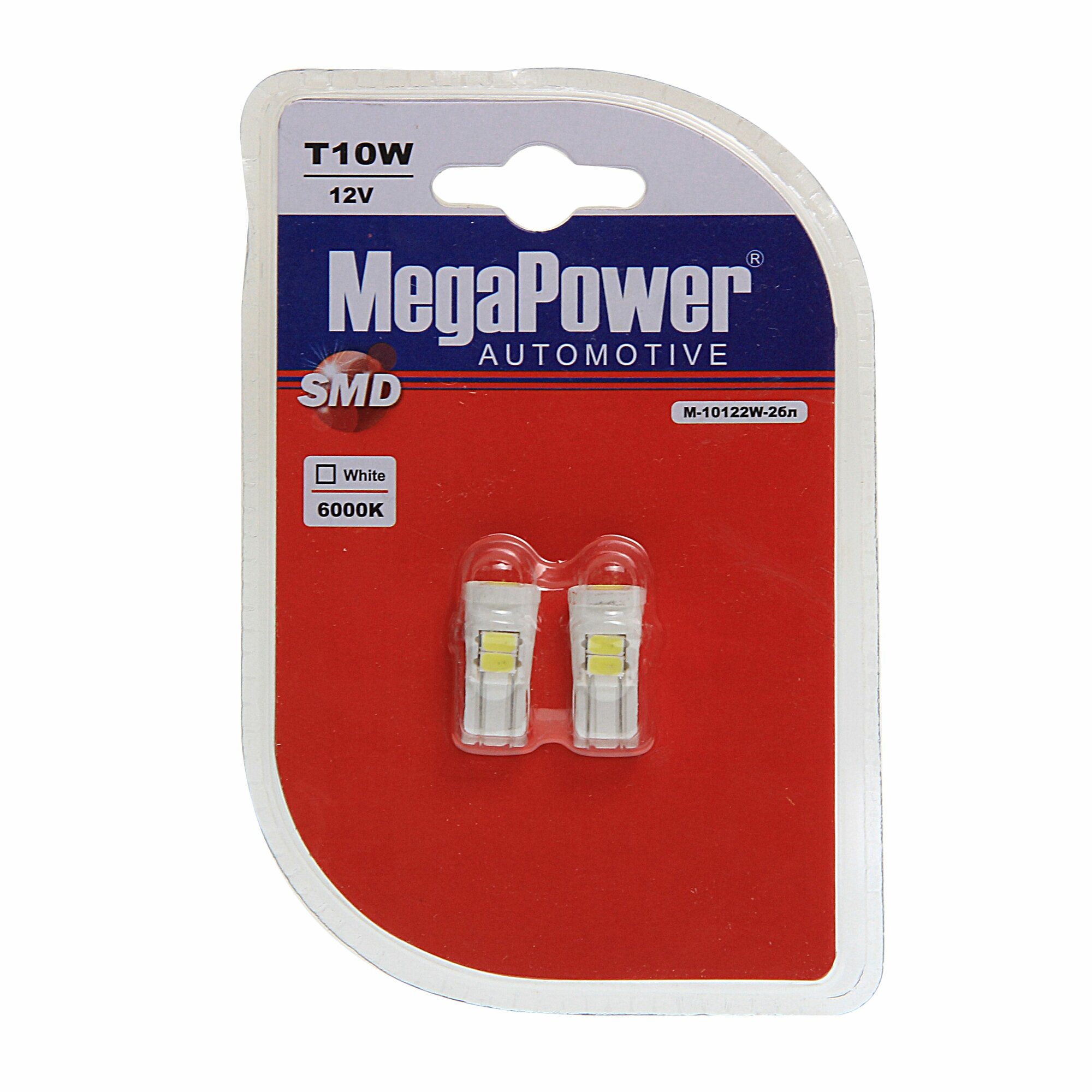 MEGAPOWER-AUTOMOTIVE 10122W-2БЛ Лампа светодиодная 12V W5W T10 W2.1x9.5d 6000K 6 LED блистер (2шт.) MEGAPOWER