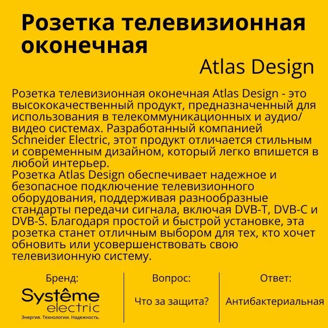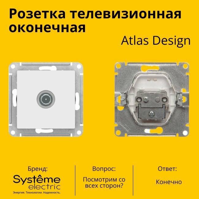 Розетка телевизионная оконечная Schneider Electric (Systeme Electric) Atlas Design 1дБ, Белый ATN000191 - 4 шт. информация: