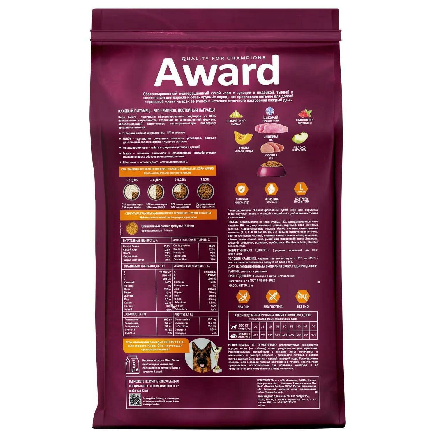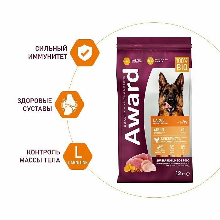 AWARD ADULT LARGE для взрослых собак крупных пород с курицей и индейкой 2 кг информация: