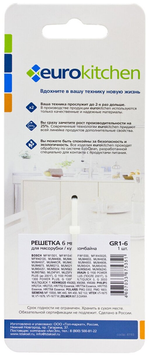Отзывы на Eurokitchen Решетка для мясорубки/кухонного комбайна с мясорубкой, 1 шт., сталь, бренд: , арт. GR1-6