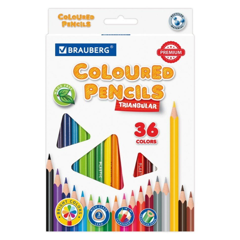 Карандаши цветные BRAUBERG PREMIUM, 36 цветов, пластиковые, трехгранные, грифель мягкий 3 мм, 181664 (арт. 181664)