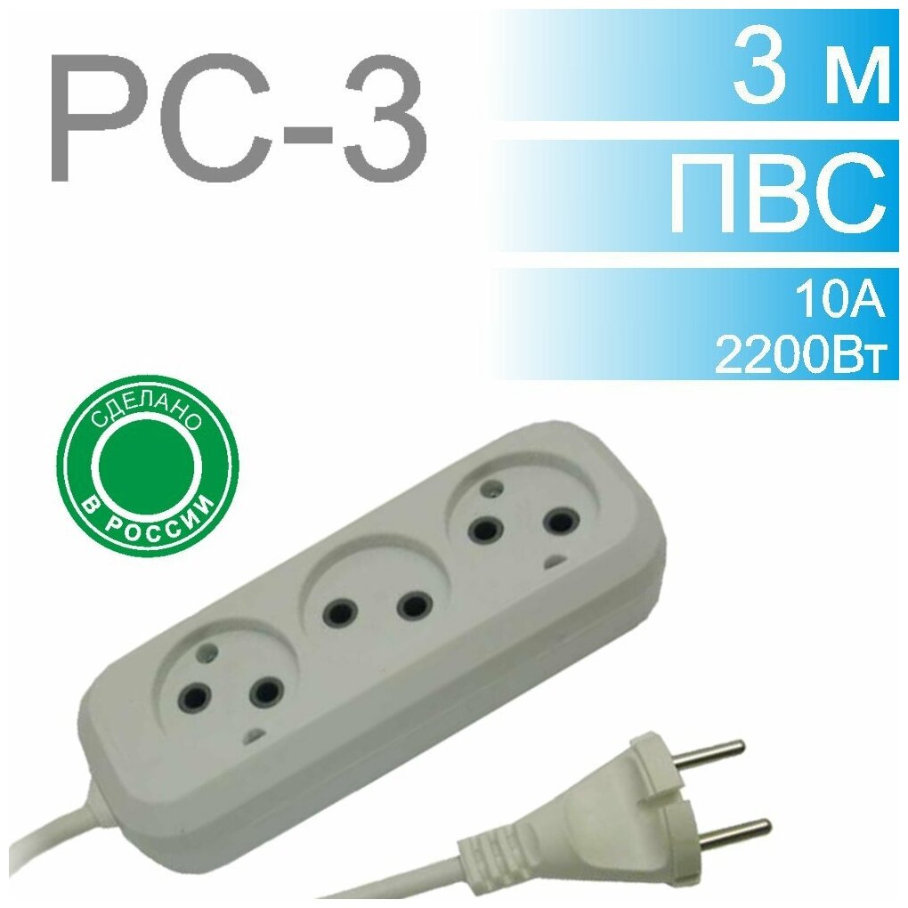 Удлинитель Джетт ПВС 2*0,75 3роз 3м 10А белый РС-3