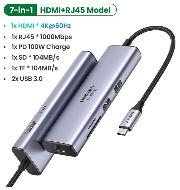 Отзывы на UGREEN Док-станция UGREEN CM512-90568; USB-C to USB-A 3.0 + HDMI (4K@30Hz) + RJ45 Gigabit +SD/TF + PD (100W)