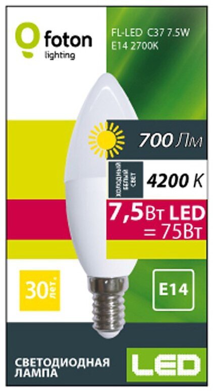 Отзывы на Лампа Светодиодная Свеча 7.5W 220-240V E14 700Лм 4200К Угол 160 град. D-37mm L-100mm Свет Нейтральный белый Foton Lighting, уп. 10шт