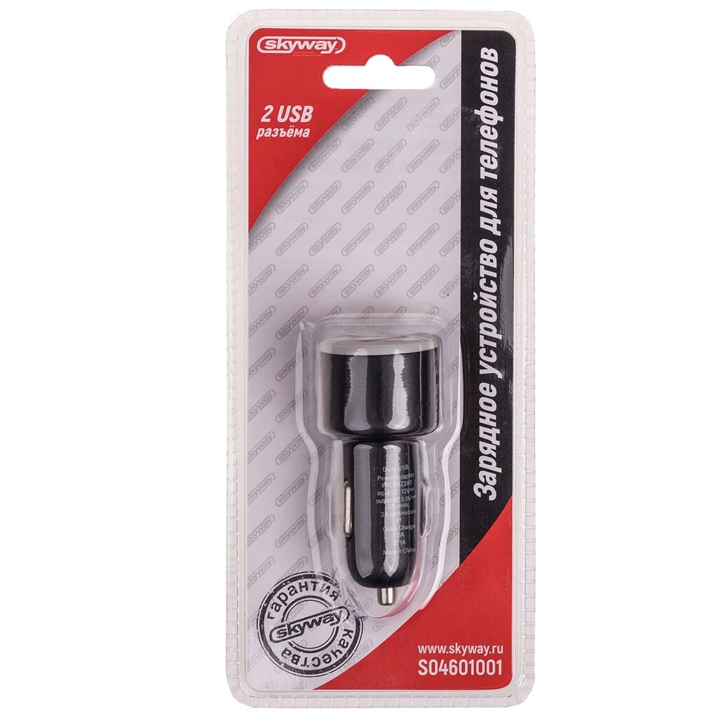 Зарядное устройство (адаптер) 12V USBх2 (1.0А+2.1А) SKYWAY. Черный в блистере