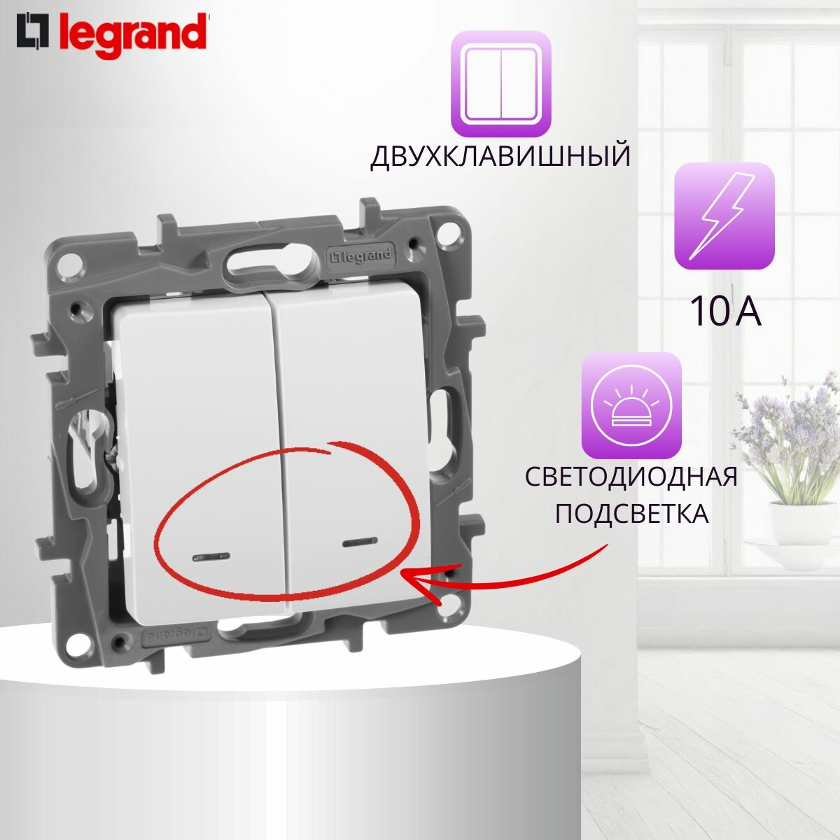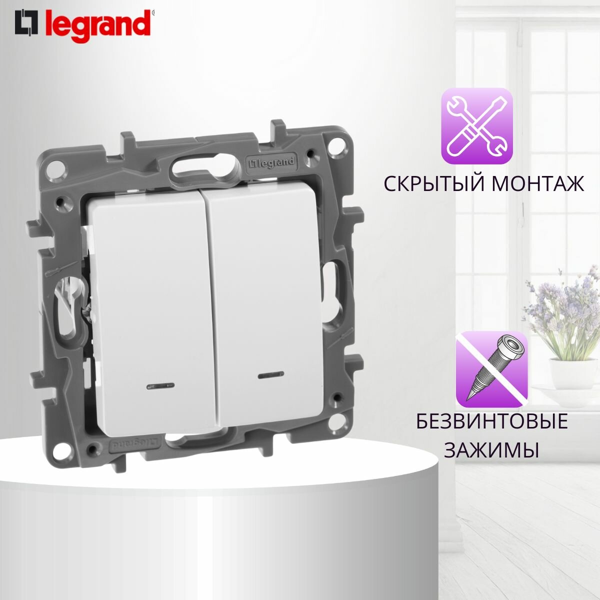 10 цен на Переключатель двухклавишный с подсветкой/индикацией Legrand Etika 10А 250В безвинтовые зажимы белый 672216 (комплект 2шт)