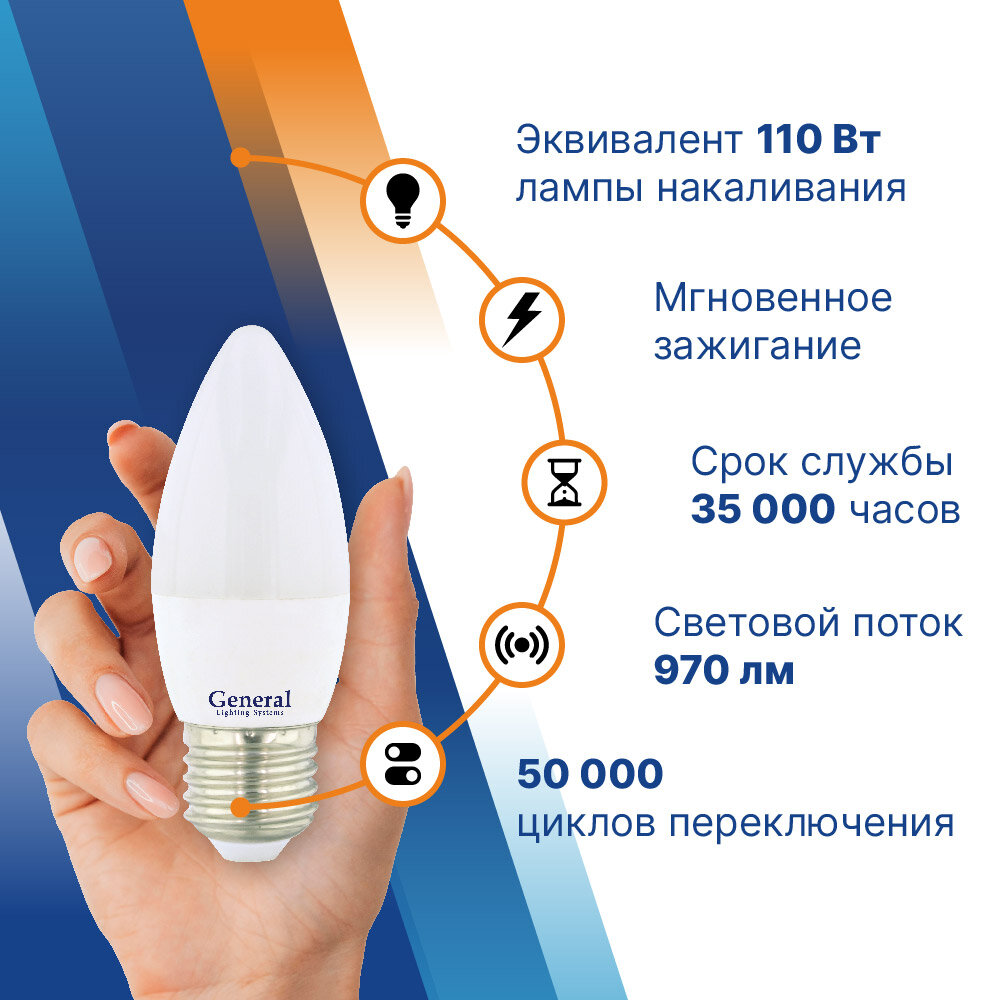 10 цен на Лампа светодиодная E27, 12 Вт, 230 В, свеча, 6500 К, свет холодный белый, General Lighting Systems, GLDEN-CF