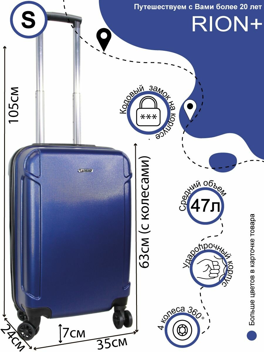 Чемодан Рион+ (RION+) R436-S, Пластик, 55 см, 43 оитра, 4 колеса, S (до 55 см), ручная кладь, синий информация: