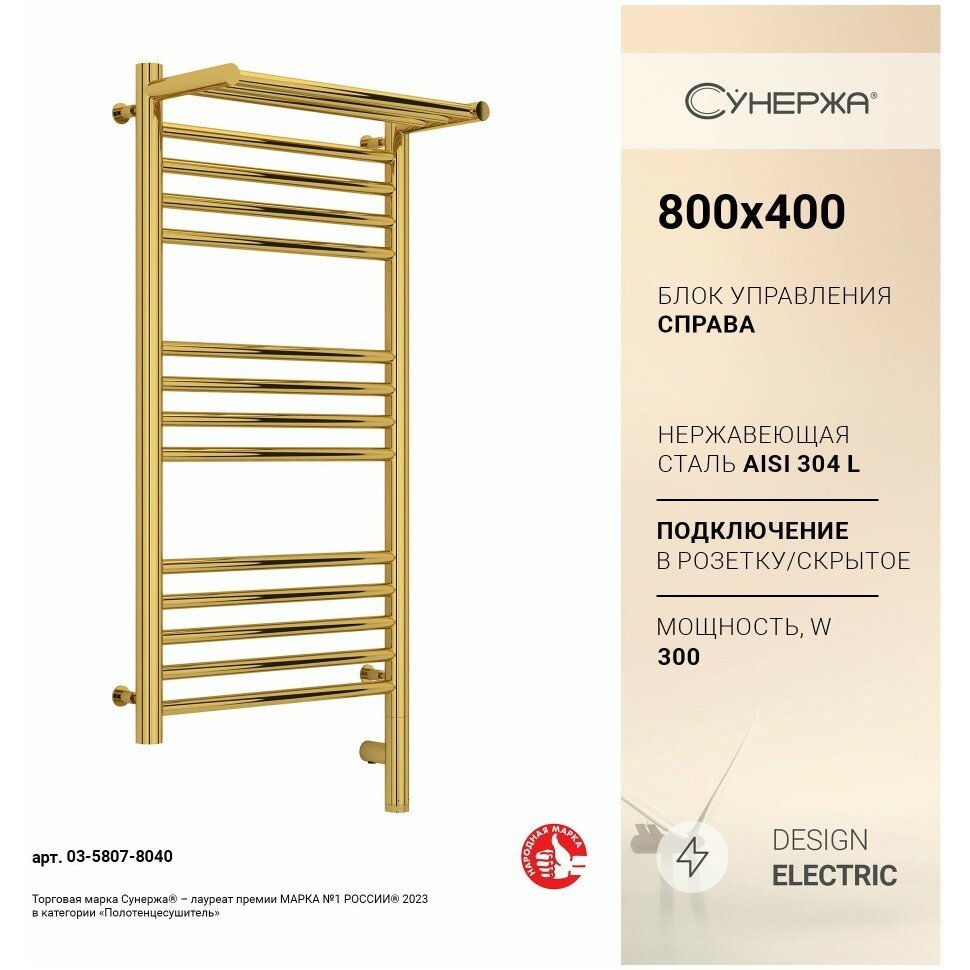 Электрический полотенцесушитель Сунержа Богема с полкой 3.0 800х400 МЭМ правый золото информация: