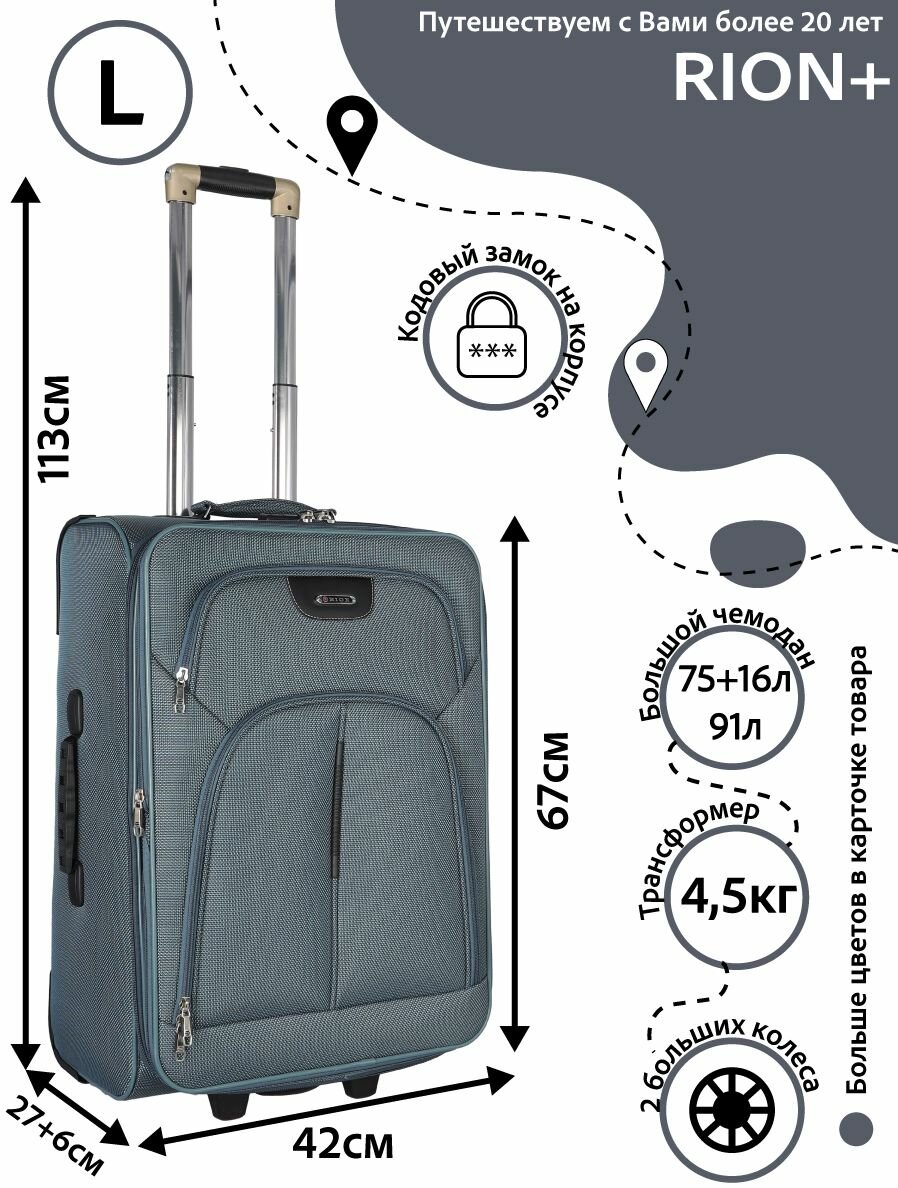 Чемодан Рион+ (RION+) R412, Ткань, 67 см, 91 литр, 2 колеса, L (70-100 см), трансформер 75+16 литров, усиленный до 25кг, серый информация: