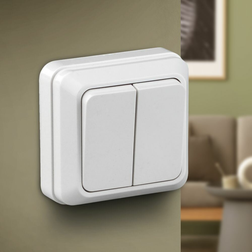 Выключатель двухклавишный Bylectrica Пралеска, брызгозащищенный, открытой установки, 6А, 250В, белый. А5 6-224.