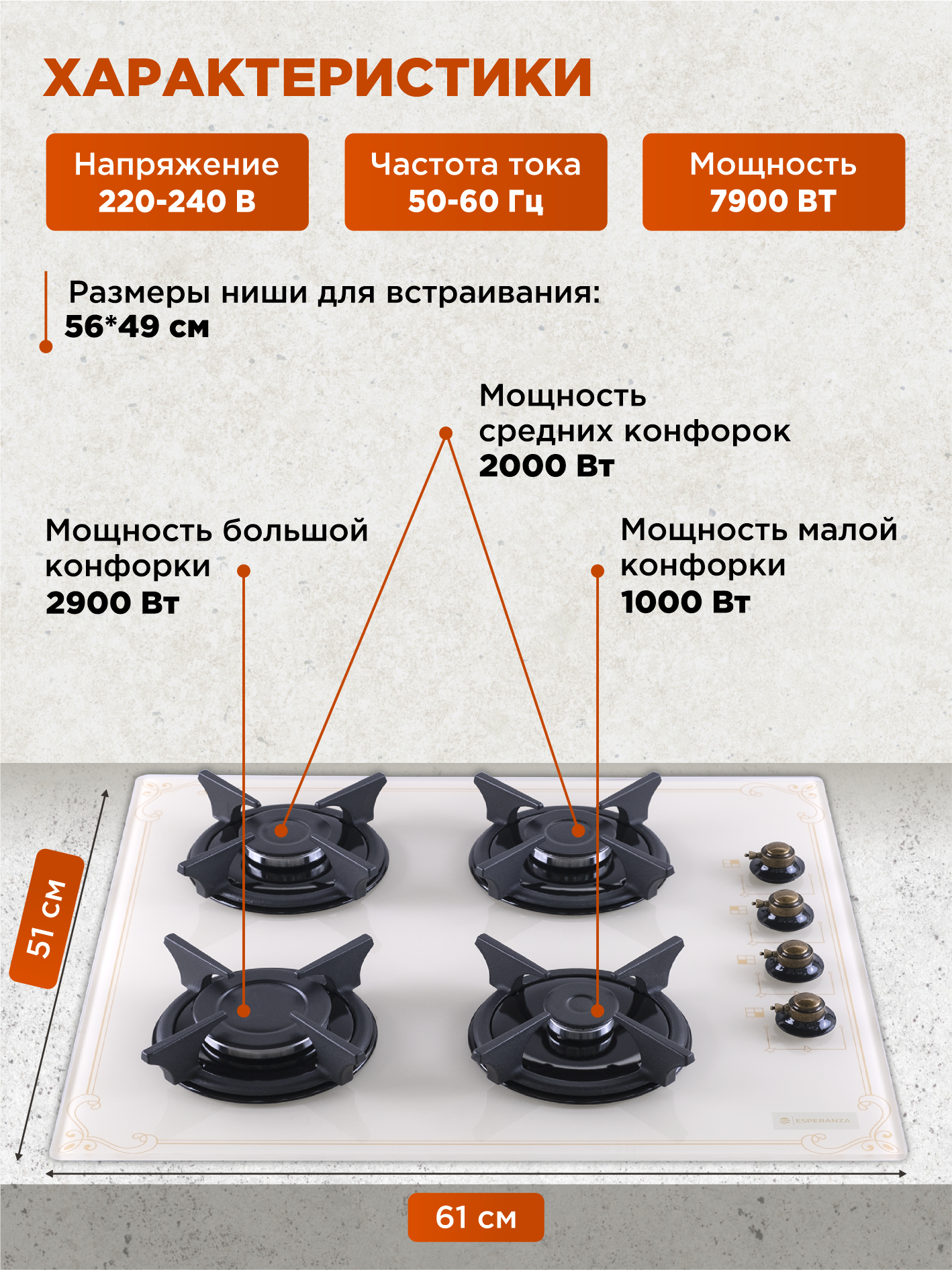 Варочная поверхность газовая ESPERANZA HG4G12 CR, закаленное стекло, чугунные решетки информация: