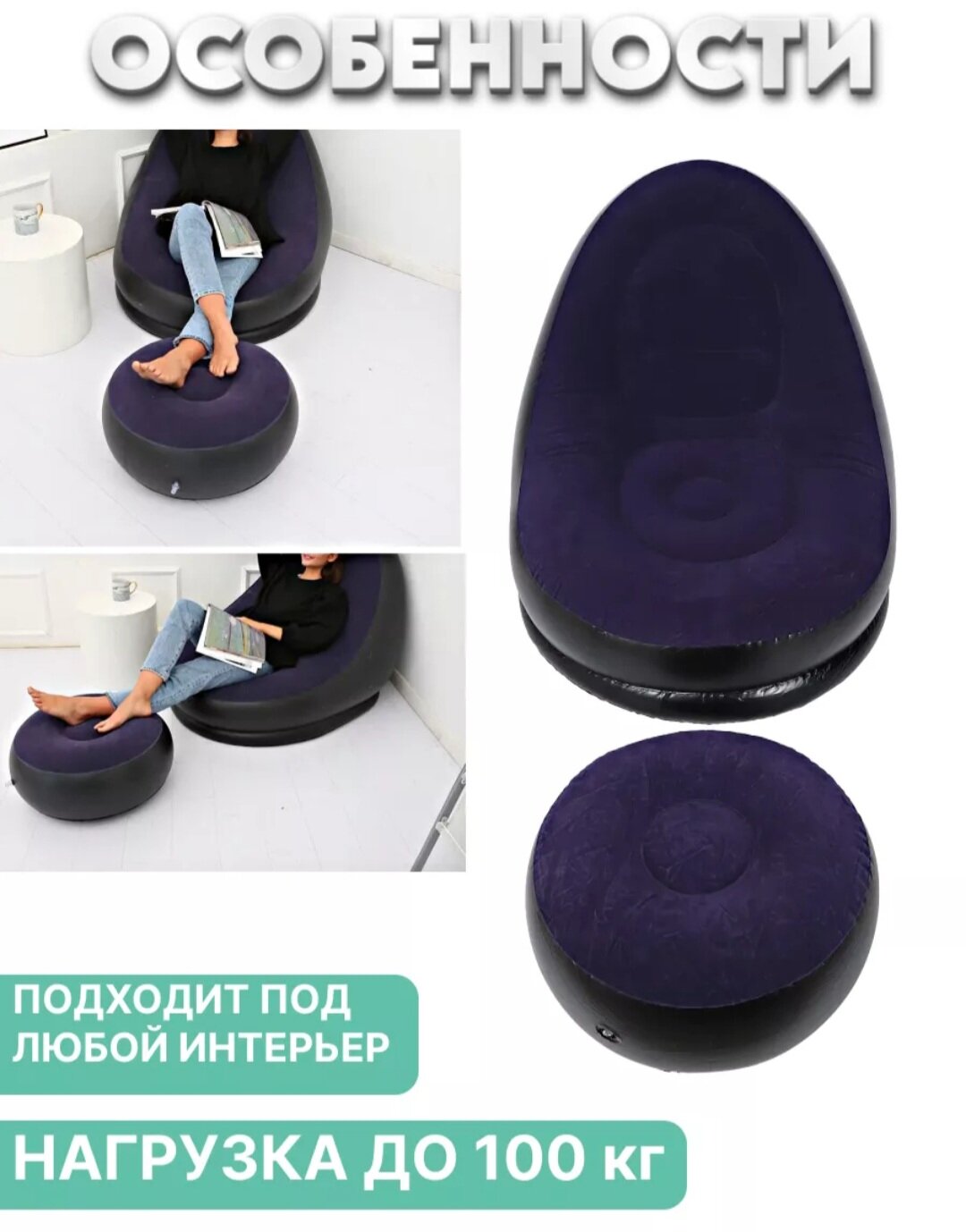 10 цен на Кресло надувное с пуфиком , с насосом в комплекте . цвет серый , темный , темно-синий