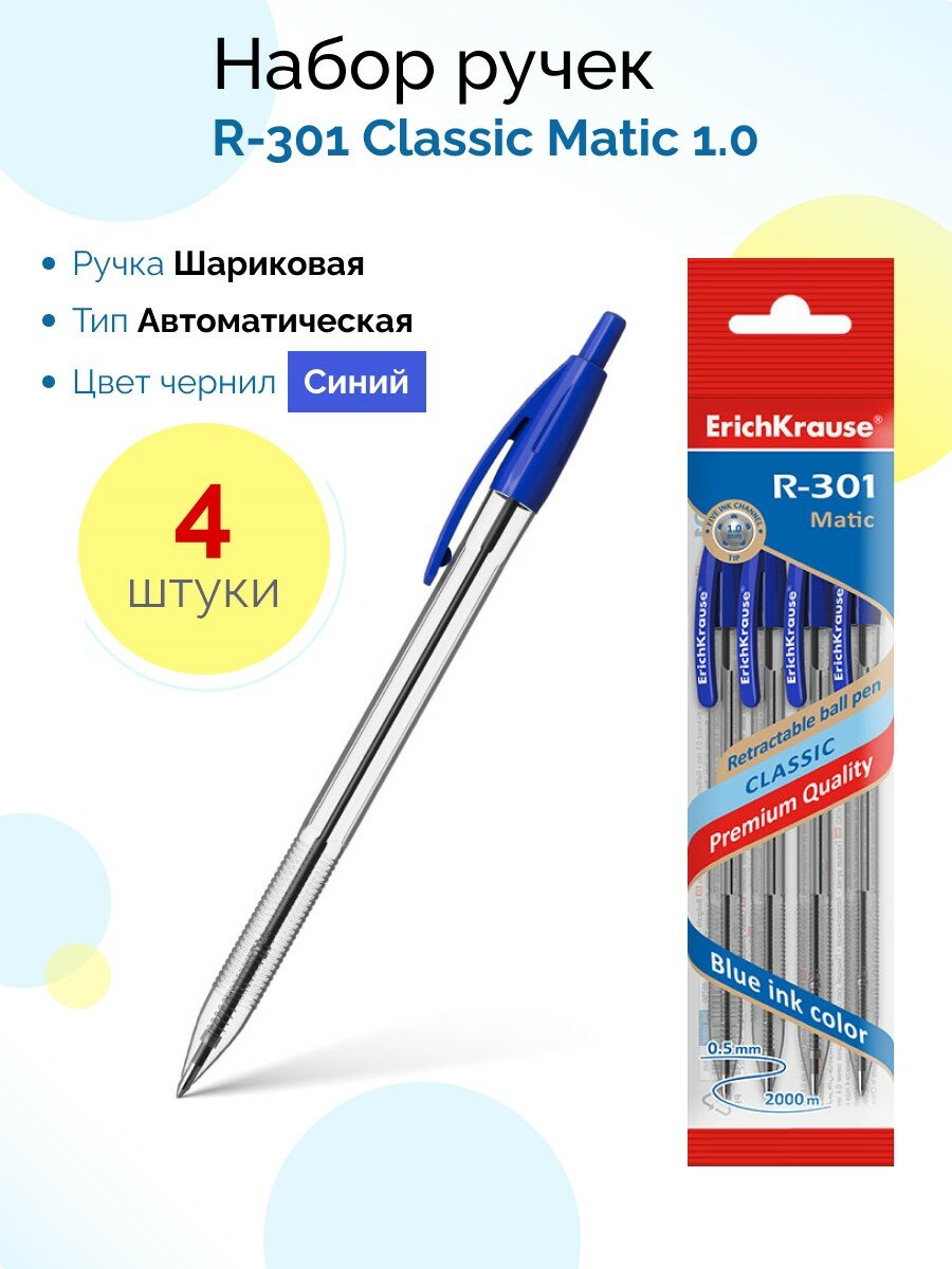 Набор из 4 ручек шариковых автоматических ErichKrause® R-301 Classic Matic 1.0, цвет чернил синий (в пакете)