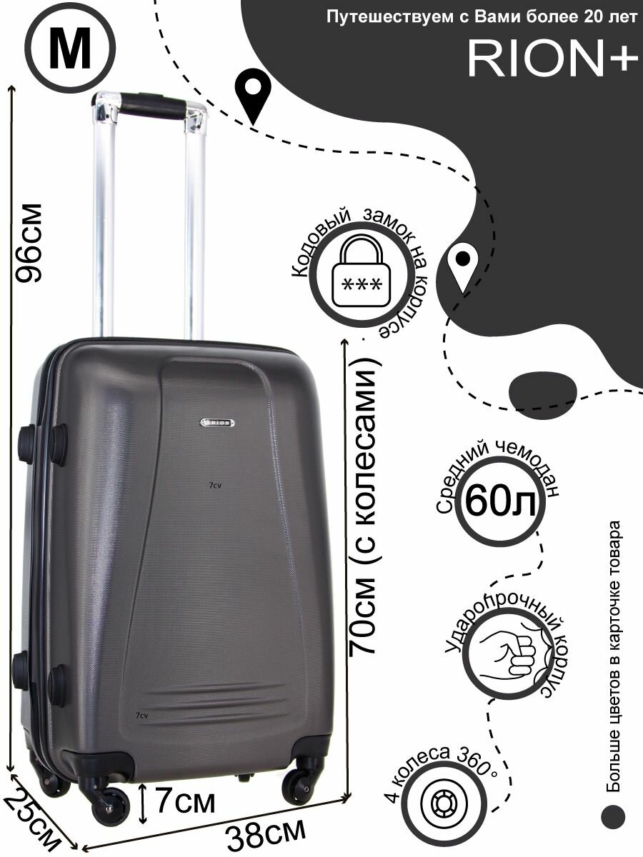 Чемодан Рион+ (RION+) R416, Пластик, 65 см, 60 литров, 4 колеса, M (56-70 см), усиленный толстый пластик, темно-серый информация:
