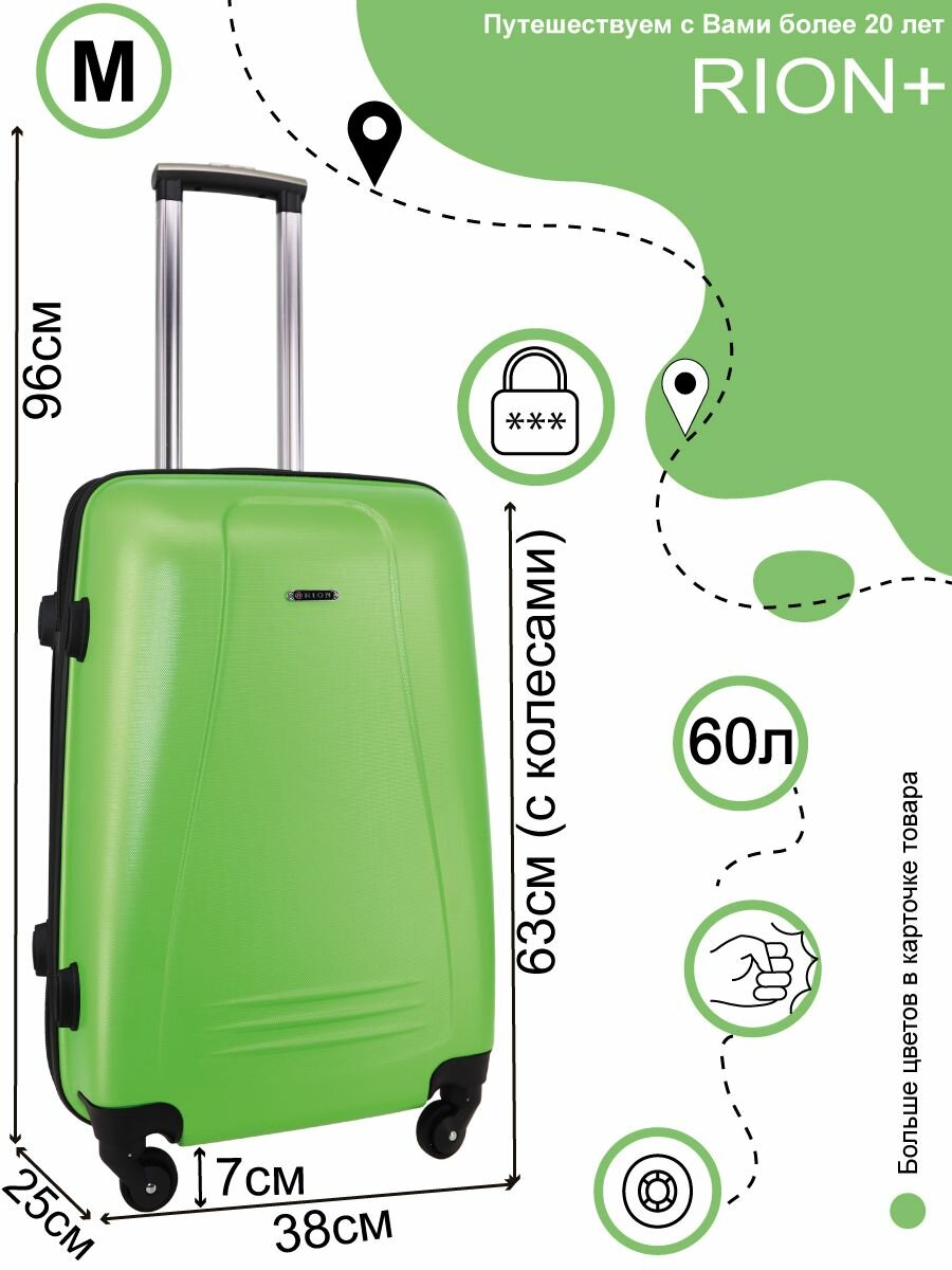Чемодан Рион+ (RION+) R416, Пластик, 65 см, 60 литров, 4 колеса, M (56-70 см), усиленный толстый пластик, салатовый информация: