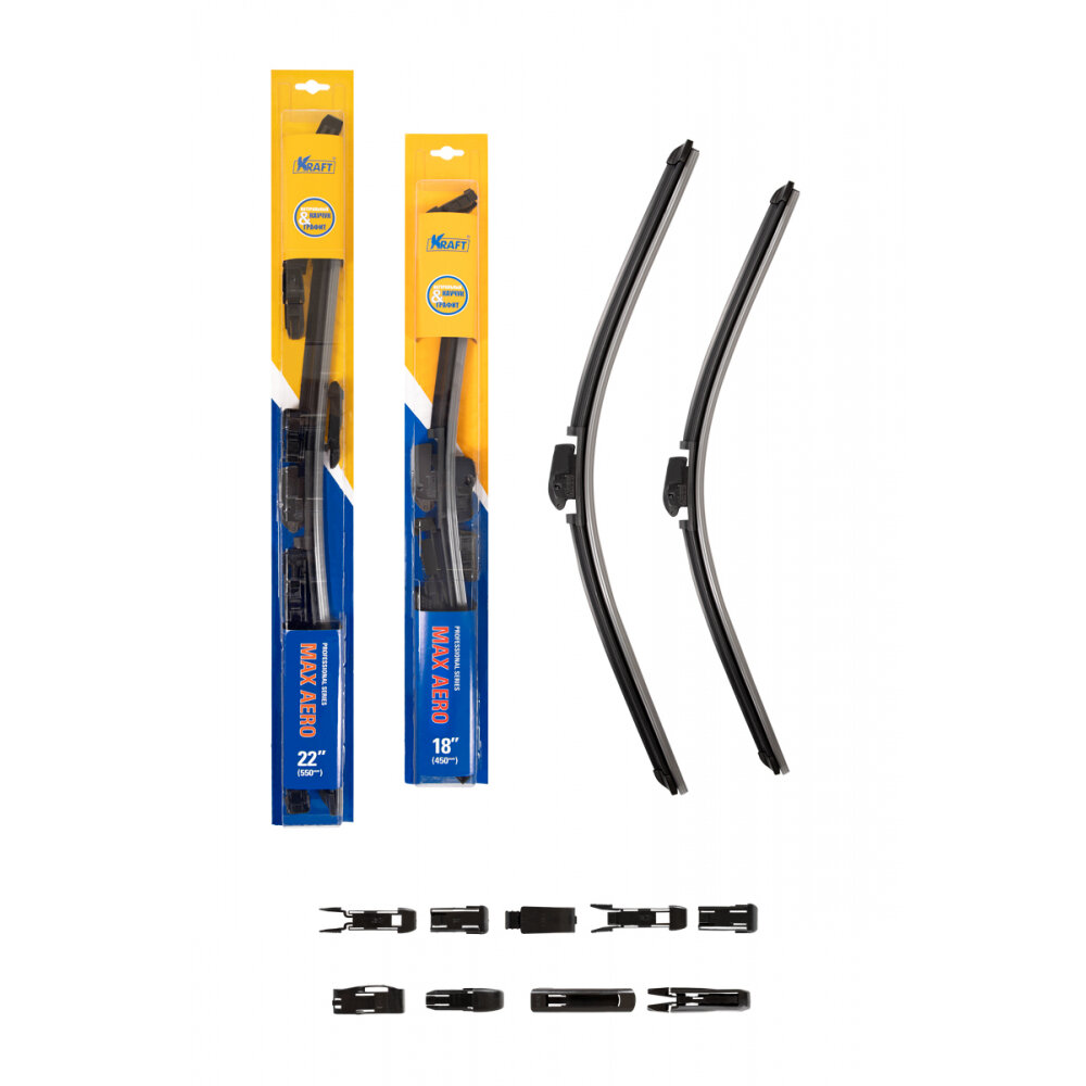 KRAFT Комплект бескаркасных щеток стеклоочистителя 550/450 мм, 10 адаптеров KT 830856