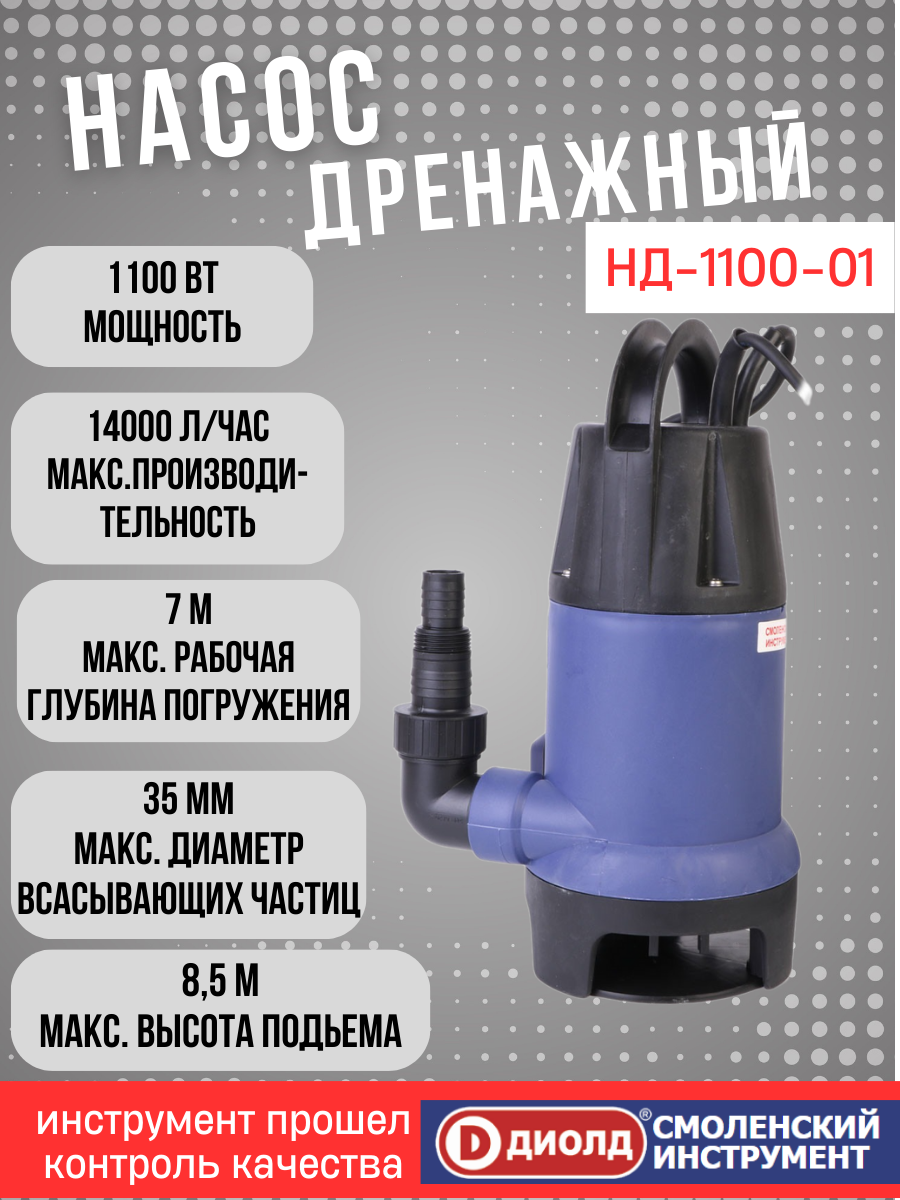 Погружной дренажный насос диолд НД-1100-01, электрический, 220В, 1100Вт, 14000 л/час, российский производитель информация: