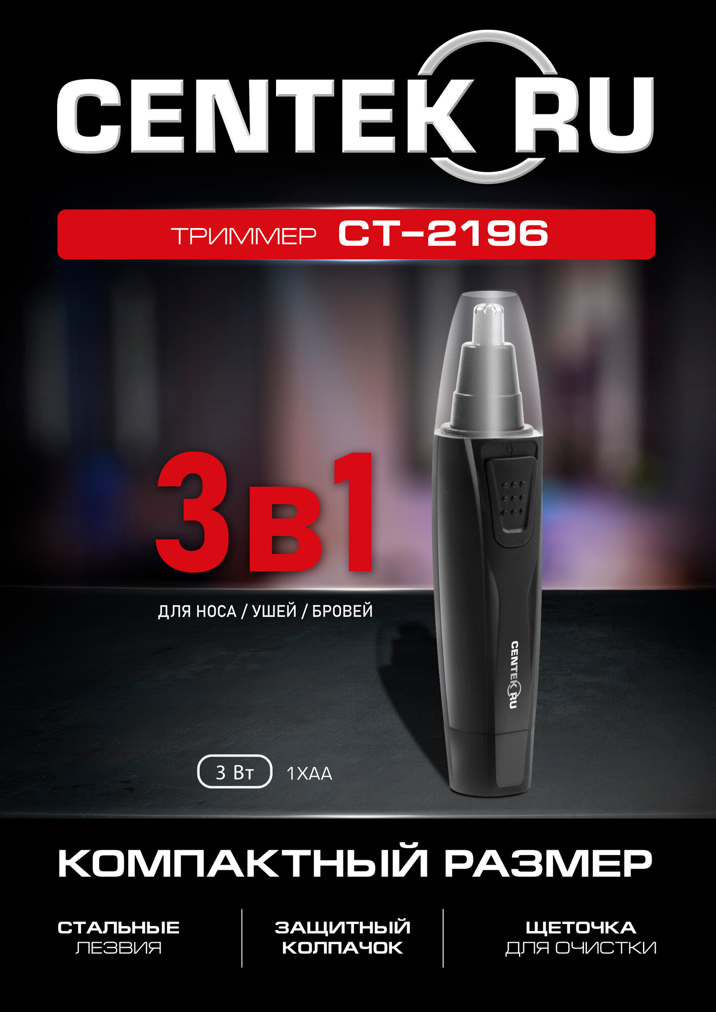 Триммер CENTEK CT-2196 (чёрн/хром) для носа и ушей, питание 1хАА (в комплекте не поставляются) 669 ₽