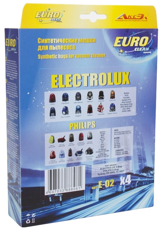 Мешки-пылесборники EUROCLEAN E-02/4 для пылесоса ELECTROLUX, AEG, PHILIPS, VOLTA, ZANUSSI, BORK, 4 шт информация:
