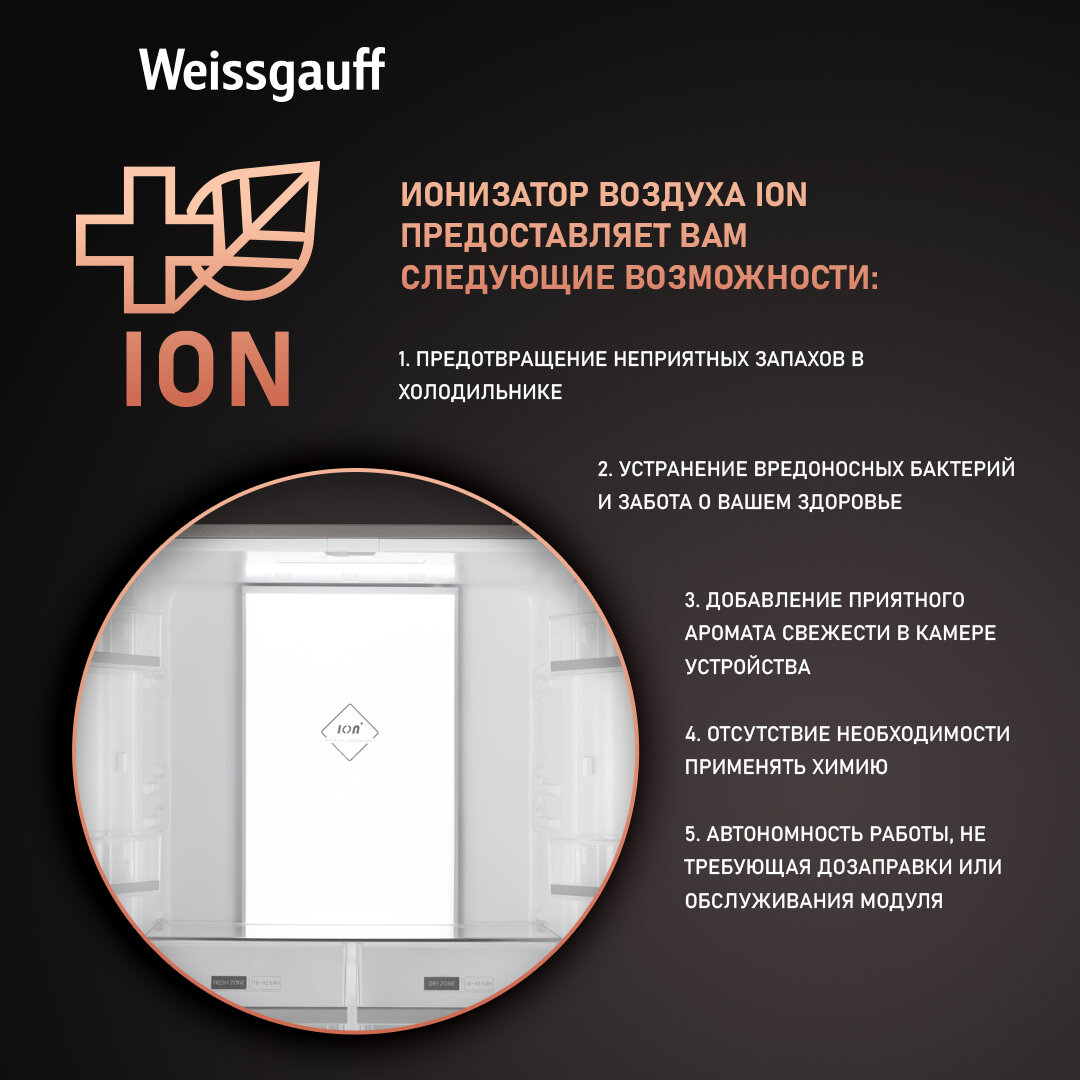 Отдельностоящий холодильник с инвертором Weissgauff WCD 450 X NoFrost Inverter четырехдверный холодильник, 3 года гарантии, система ионизации воздуха, большой объем, тихий режим, Зона свежести с контролем уровня влажности, LED-освещение 72 164 ₽