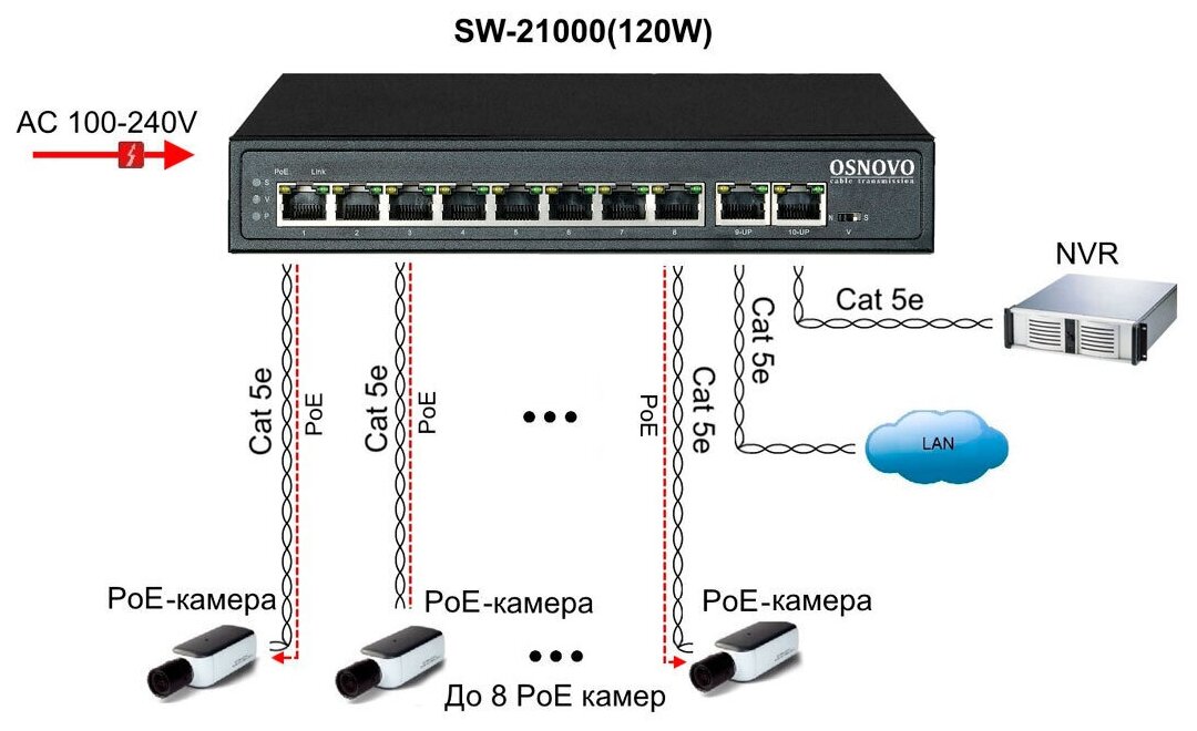 Коммутатор OSNOVO SW-21000(120W) (PoE коммутатор, 8 x FE с поддержкой PoE (IEEE 802.3af/at), 2 x FE, до 30W на порт, суммарно до 120W)