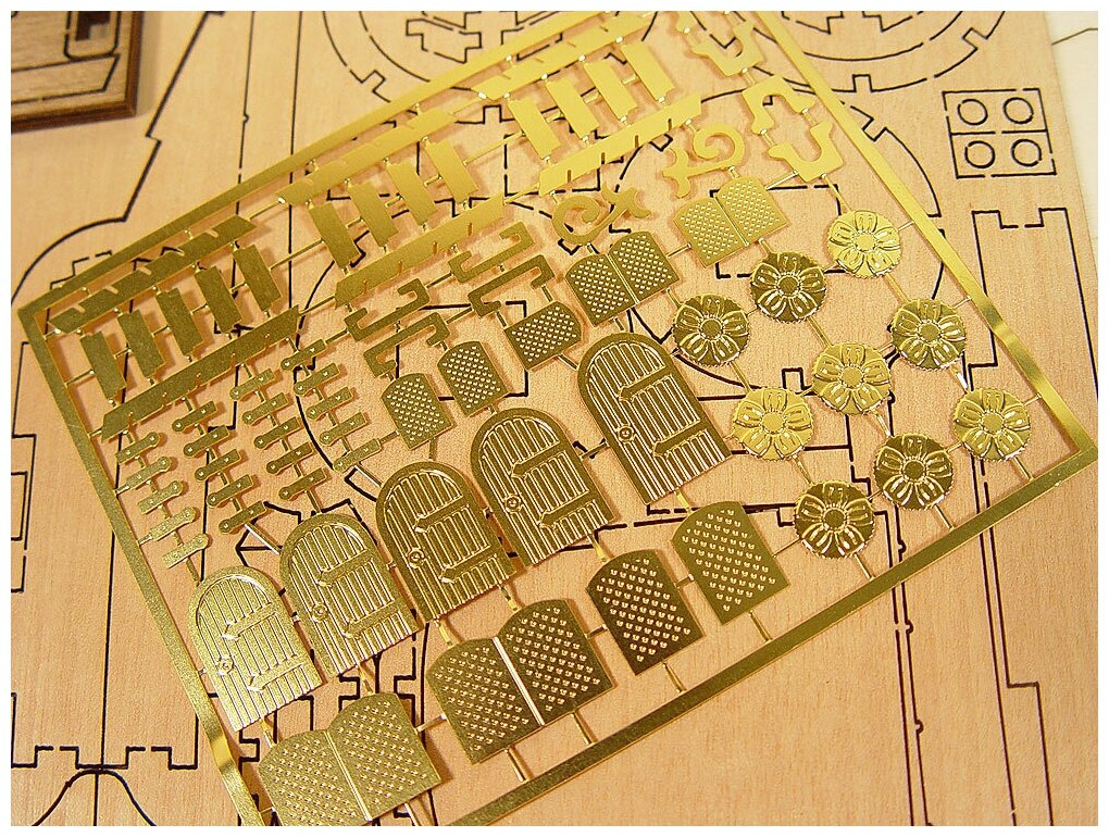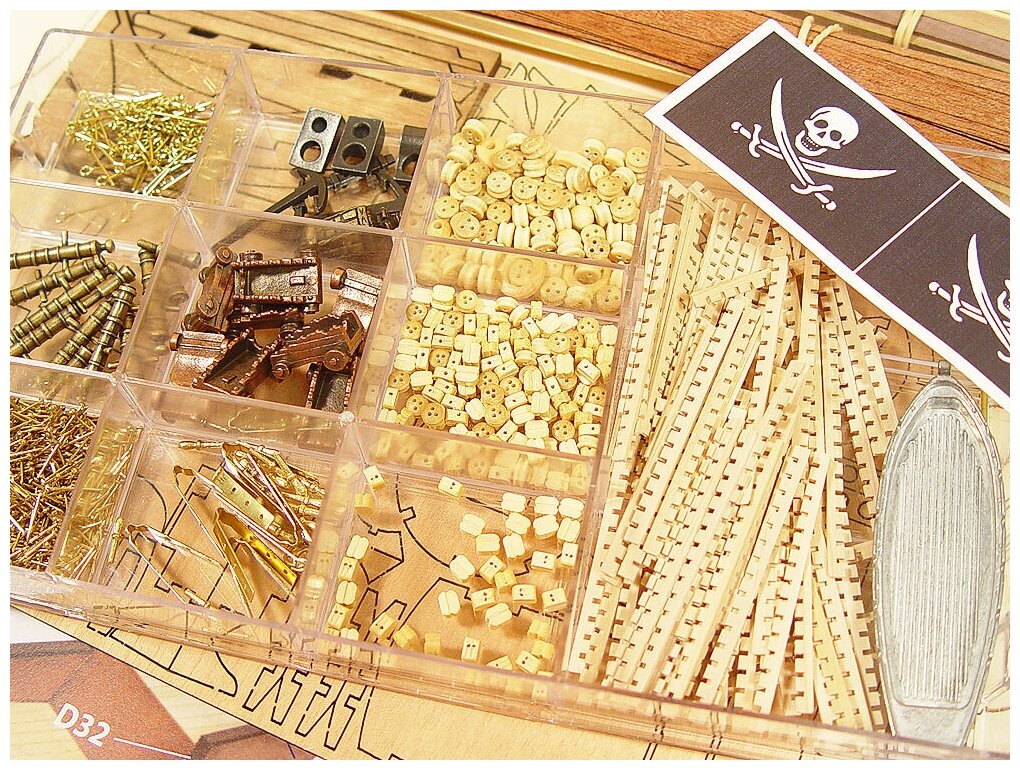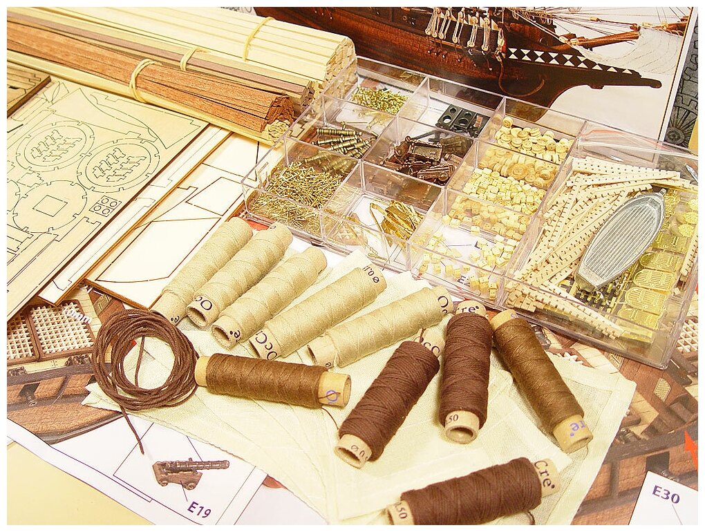 | Комплектация | корпус с двойной обшивкой и настилом палуб отдельными рейками / готовые фальшборта с прорезанными лазерной резкой пушечными портами / деревянные решетки / восемь литых пушек на металлических лафетах и четыре фальш-пушки / кормовой фонарь / якоря / нагеля / эзельгофты / шлюпка из металла / латунные петли для руля / рымы / цепочка / фототравленные двери / утки / сборные трапы / кормовой декор и петли пушечных портов / круглые заготовки светлого дерева для рангоута / светлые и темные нити разных диаметров для такелажа / блоки и юферсы из светлого дерева / готовые паруса / иллюстрированная инструкция |